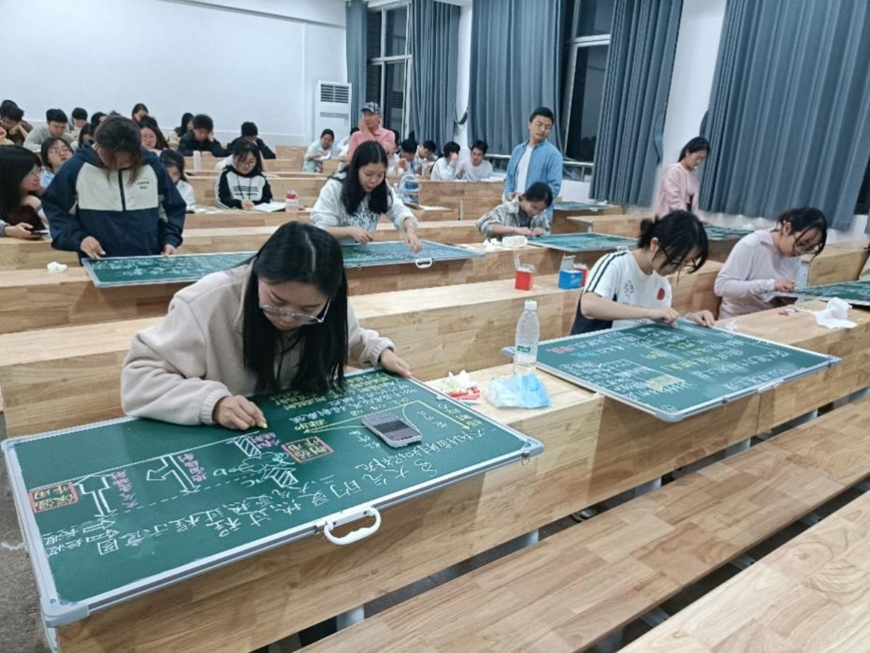 作品展示环节,十一幅小黑板整齐陈列于展区,形成一道独特的“地理知识长廊”。由专业教师、同专业学长学姐组成的评委团,从“内容科学性”“板书规范性”“设计创新性”三个维度进行评分。同步开展的观众投票环节中,到场学生通过投票为心仪作品助力。