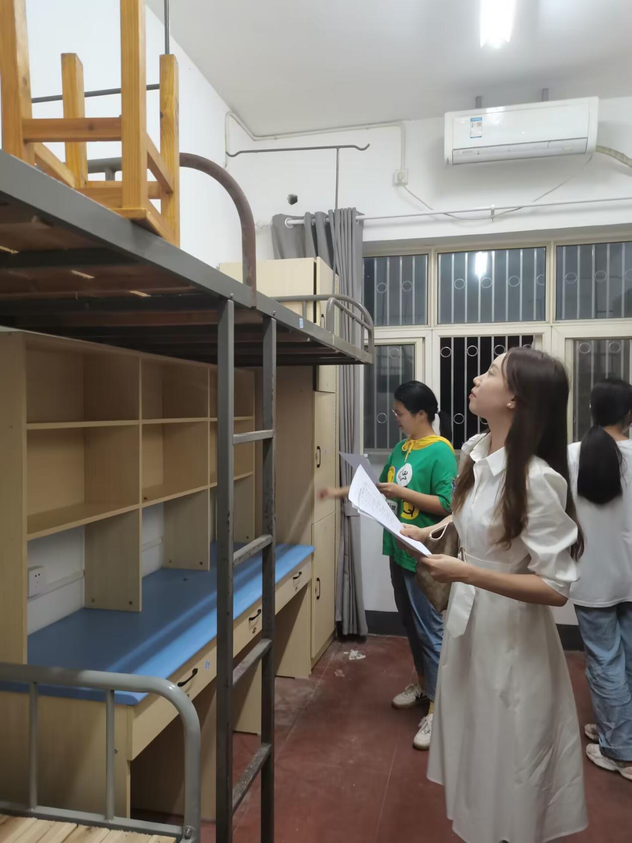 彭老师等一行在走访寝室的过程中,着重检查了宿舍床铺橱柜、洗手间墙壁等卫生死角,确保宿舍正常供水供电,力求为即将到校的新生提供一个干净整洁的住宿环境。除此之外彭老师对宿舍用电安全方面进行重点检查,对发现的问题提出整改建议并要求落实到位。