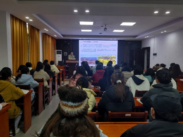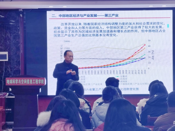 12月17日上午,由本科生院主办,地球科学与空间信息工程学院承办的“课程思政示范课”第七十六讲在地学楼206精彩开讲。本次示范课由尹定财博士主讲《中部地区发展》,活动由地空学院副院长戴德求主持,学院师生代表到场观摩。