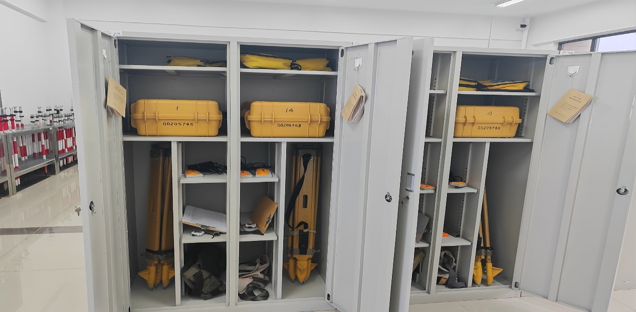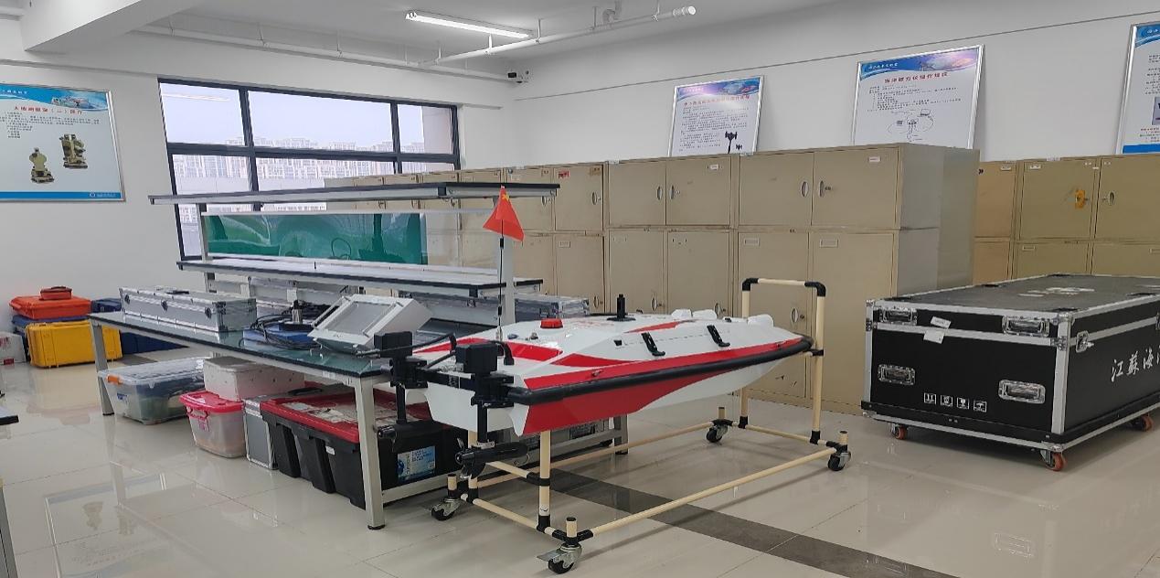 在参观过程中,见证了海测学院先进的测绘仪器和设备。实验室配备了最新的海洋测量设备、全站仪、高精度水准仪、光谱仪、无人测量船和无人机等设备,分设测绘数据处理室、数字摄影测量室、地理信息系统室以及遥感仿真实验室等多个教学室,每个教学室仪器设备都编号明确,摆放整齐,使用记录清晰,每台仪器设备都可以溯源使用者,管理规范严格。其自主设计的仪器存放柜完美的契合了测绘仪器特征,给人留下了深刻印象。其遥感仿真实验室将室外实验完整搬到了室内,大大提高了教学效率以及学生的学习兴趣,是实验室建设一大特色亮点。