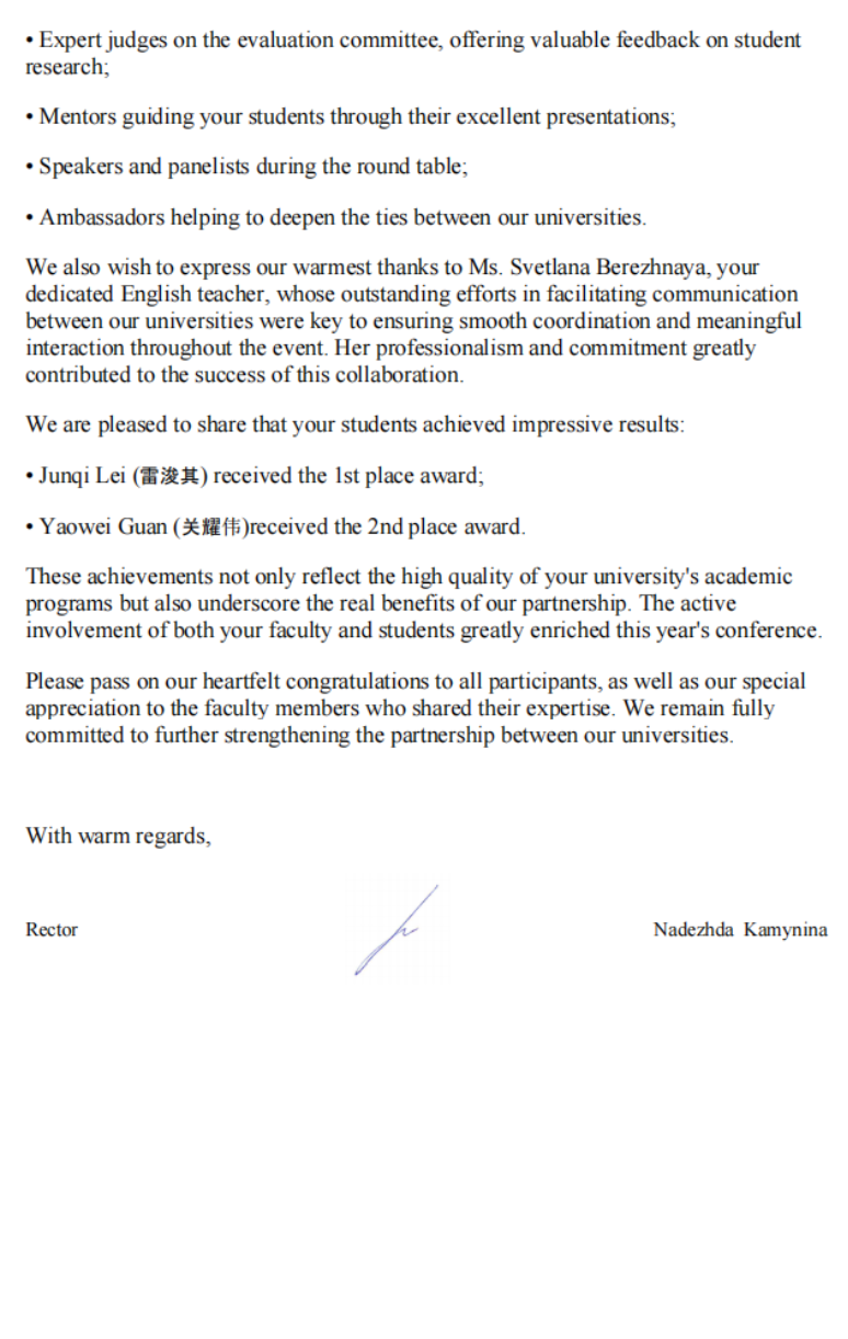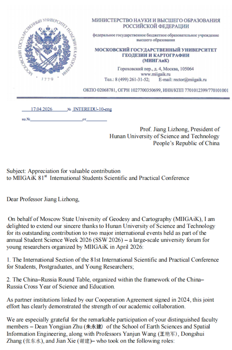 4月15日至16日,色情动漫 与莫斯科国立测绘大学共同举办了第81届国际科学和实践线上研讨会“the 81st International Scientific and Practical Conference for Students, Postgraduates and Young Researchers, Student Science Week-2026 (SSW-2026)”,色情动漫 院长朱永建教授在会上致辞,介绍了色情动漫 “湖科大二号”卫星发射及学校“一站两中心”建设情况,建议两校在科教融合、人才培养方面开展全面合作。会后,莫斯科国立测绘大学给色情动漫 发来感谢祝贺信。