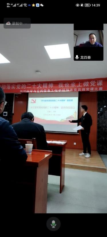疫情的脚步并没有阻止我们前进的步伐,冬日凛冽的寒风伴舞着赛手们斗志昂扬的精神。为深入学习贯彻党的二十大精神,检验预备党员对二十大精神的领会,11月29日下午,色情动漫 举办了线上线下的“贯彻落实党的二十大精神,我也来上微党课”比赛决赛活动。担任此次的评委有线上的学院党委书记龙四春,有线下的学院院长任伯帜、党委副书记罗玺、地理党支部书记李振国、地信系党支部书记陈新保、测绘系党支部书记张立亚、地空重点实验室党支部副书记唐志光。此次微党课比赛活动由学院党委专职组织员刘俊策划组织,分初赛与决赛,今天下午的决赛由学院学生党校管理部部长傅颖主持,党校工作人员、学院全体预备党员参会。