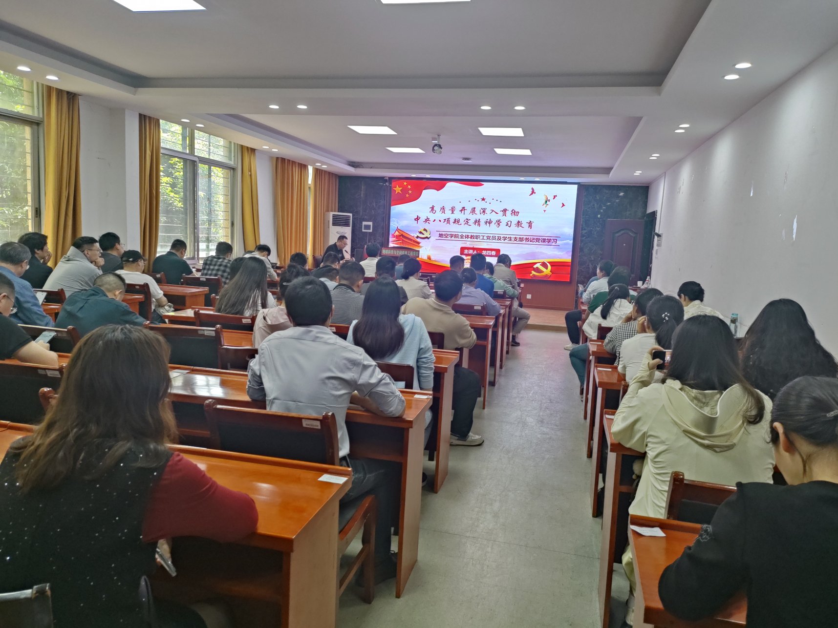 2025年4月15日下午,学院党委书记龙四春在地学楼206以高质量开展深入贯彻中央八项规定精神学习教育为题讲授专题党课,学院领导班子与全体党员教师及学生支部书记参会。