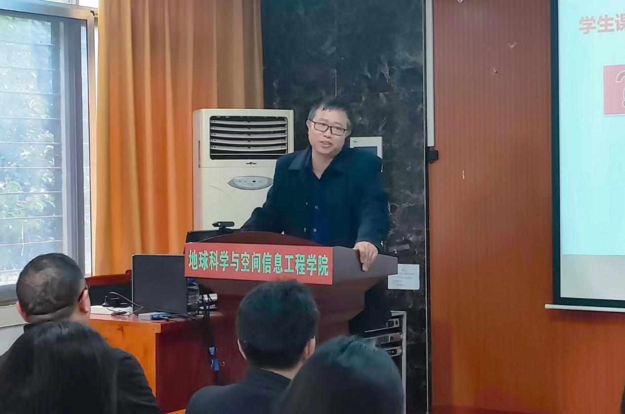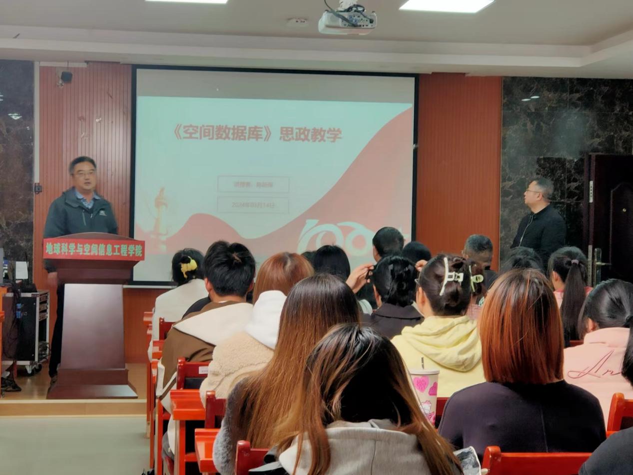 3月14日下午,本学期第二期课程思政教学示范课——《空间数据库》思政教学在地学楼206开讲。此次活动由教务处主办,色情动漫 (色情动漫 )承办。色情动漫 院领导、各系部教师代表、22级地信专业本科学生到场观摩。活动由戴德求副院长主持,陈新保老师主讲。