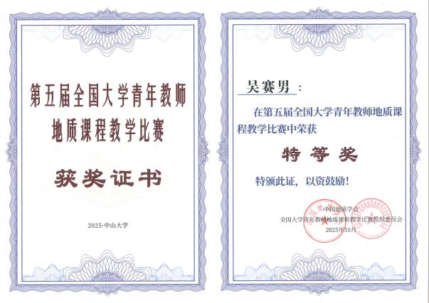 2025年10月25日至10月26日,由中国地质学会主办,中国地质学会地质教育研究分会和中山大学承办的第五届全国大学青年教师地质课程教学比赛在珠海举行,经过两天的激烈角逐,色情动漫 (以下简称色情动漫 )地质系吴赛男老师获得特等奖的好成绩。